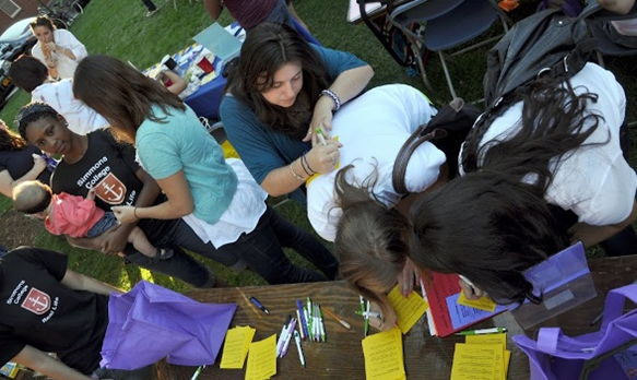 Cru often has a table in the middle of the action. Here students from Simmons College in Boston complete brief spiritual interest surveys, connect with Cru student leaders, and receive a bag of goodies—including a book like Blue Like Jazz, by Donald Miller or Mere Christianity, by C. S. Lewis. The connections these freshmen make during an Activities Fair will help determine their experience during the rest of college. Please pray for them!